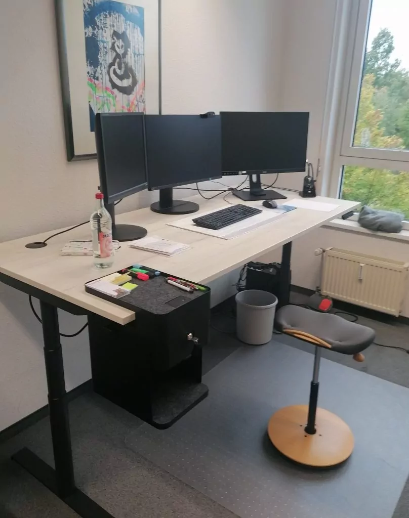 Darum modernisieren wir Schritt für Schritt die Arbeitsplätze in unserem Büro. Ab sofort stehen unserem Team zwei weitere höhenverstellbare Schreibtische zur Verfügung. So können die Kolleginnen und Kollegen flexibel zwischen Sitzen und Stehen wechseln.